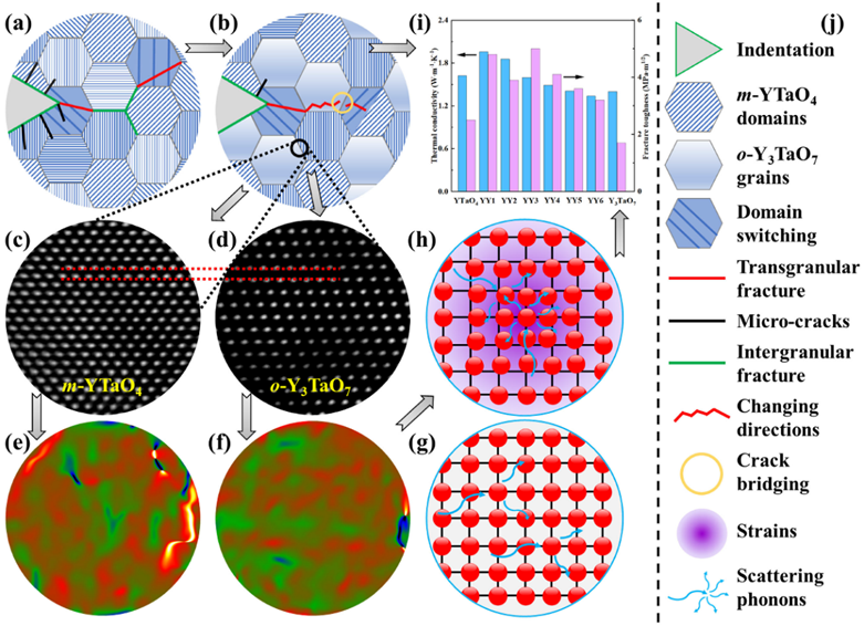 高韧性、低热导是保障陶瓷热防护涂层材料长寿命、高隔热的核心性能指标,但是在氧化物陶瓷中其热导率与断裂韧性之间存在相互耦合限制的关系。氧化物陶瓷硬而脆,高硬度意味着高的声子传播速度,从而产生高的热导率,传统性能优化方式难以打破脆性陶瓷“高韧性-低热导率”之间的耦合限制关系。昆明理工大学陈琳、冯晶团队十余年来深耕铁弹性陶瓷热防护涂层材料领域,在本研究中通过球差矫正透射电镜原子级别表征提出了铁弹畴增韧新理论,在应力作用下铁弹畴通过偏转裂纹、畴转变、裂纹桥接等方式消耗断裂能提高断裂韧性;同时,研究团队在铁弹性陶瓷中通过引入与其具有类共格界面的增强相,并通过SPS和高温热处理的方式加速元素迁移,在晶格中引入高密度位错,在脆性陶瓷中构建了“铁弹畴+高密度位错”增韧新机制。铁弹性复合陶瓷断裂韧性最高值可达5.0 MPa·m1/2,相较于单相材料提高达100%,断裂韧性是传统YSZ材料的1.4倍。