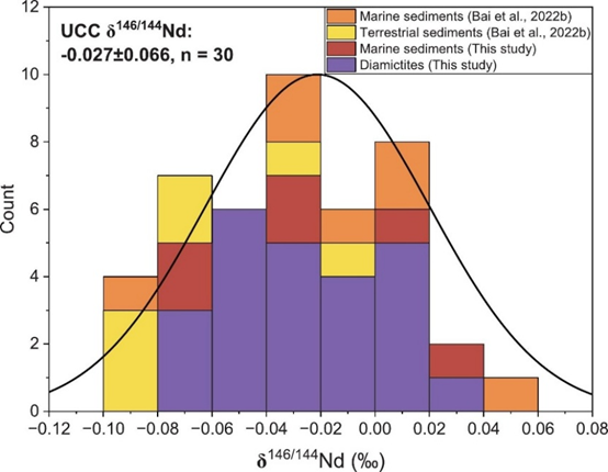 对这些样品的稳定Nd同位素测量显示,太古代以来的冰碛岩和现代边缘海沉积物的稳定Nd同位素组成在误差范围内一致,同时系统分析表明岩浆分异等高温过程不会改变上地壳稳定Nd同位素组成。进一步的分析显示,这些样品的稳定Nd同位素与指示风化强度的化学蚀变指数(CIA)具有较强的负相关性,但整体上δ146/144Nd的变化没有超过0.1‰,说明这种相关性为假相关。这一结果说明弱-中等风化强度基本不会改变稳定Nd同位素的组成,这与海南玄武岩和全球沉积物研究结果一致。本研究代表全球上地壳组成的冰碛岩和现代边缘海沉积物样品的稳定Nd同位素组成仍然在误差测量范围内一致,说明地质历史时期大陆上地壳的分异与演化过程中没有改变稳定Nd同位素组成。基于以上结果,团队率先评估和计算了大陆上地壳稳定Nd同位素组成(图2;δ146/144 = -0.027±0.066‰,n=30)。