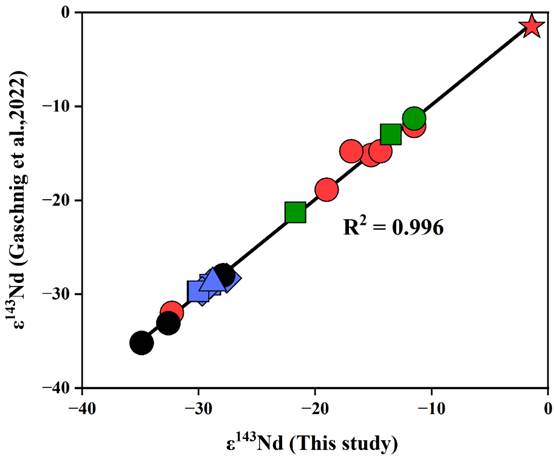 另外,更值得说明的是,本研究同时测定这些样品的放射成因Nd同位素(ɛNd)与文献经典方法报道的数据在误差范围内完全一致,再一次证明了团队前期建立同时测定放射成因和稳定Nd同位素方法的可靠性(Bai et al., 2021, 2022)。考虑到目前全球放射成因Nd同位素数据库基本已经建成,如若放射成因Nd同位素测试有误,则必然是144Nd所引起,那稳定Nd同位素(146Nd/144Nd)的测试结果也必然受到影响。这相互印证的结果从另外一个角度进一步说明叁Nd同位素数据同时测定的必要性。本研究为这一方向的进一步探索打下了坚实的基础,为未来的叁Nd同位素研究提供了有力的支持。