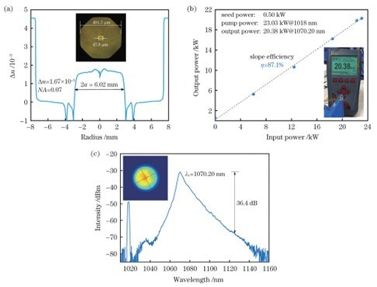 图 预制棒折射率分布、光纤端面及激光性能测试结果。(a)预制棒折射率分布和光纤端面;(b)输出功率与泵浦功率之间的关系曲线;(c)20 kW功率下的激光光谱,插图为激光光斑