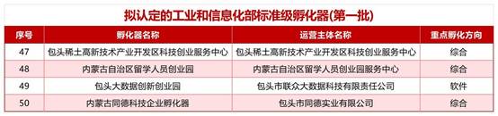 近日,工业和信息化部公示科技型企业孵化器拟认定名单,我市的稀土高新技术产业开发区科技创业服务中心、内蒙古自治区留学人员创业园、包头大数据创新创业园、内蒙古同德科技企业孵化器4家孵化器成功跻身标准级孵化器(第一批)榜单,入榜数量位居自治区第一。